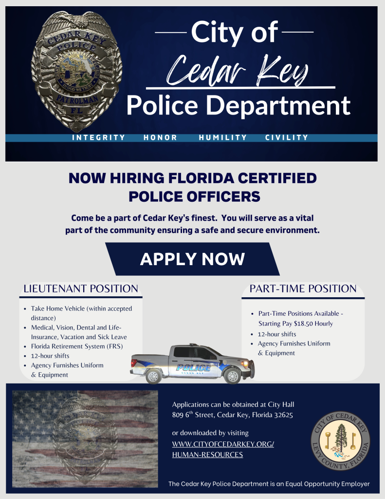 CKPD HIRING: Cedar Key Police Department has positions available. Submit resume and cover letter to the City of Cedar Key, Chief Edwin Jenkins. Position open until filled.